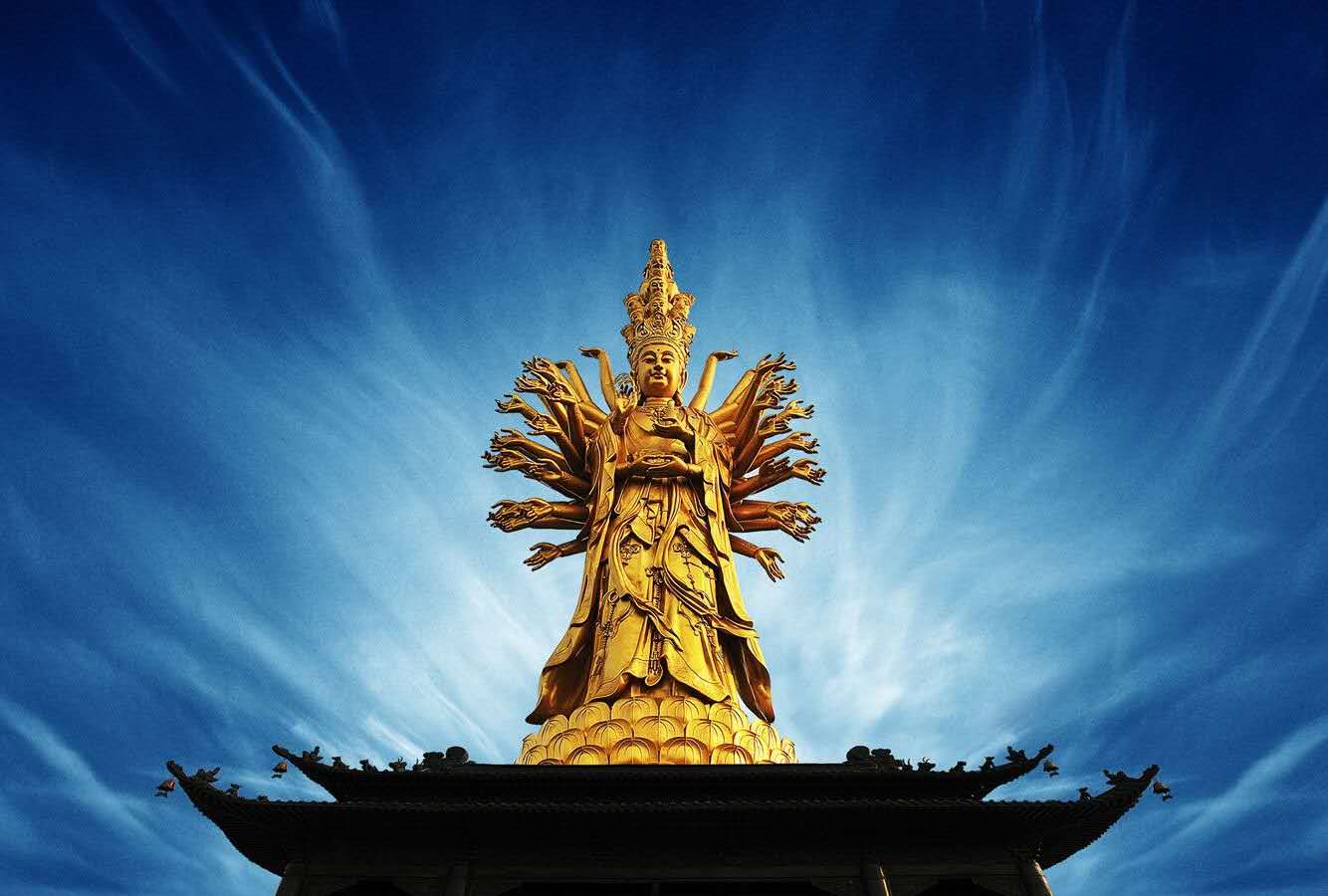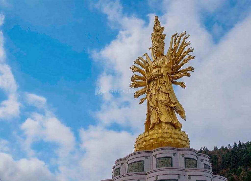 位于密印寺的后面,有高達(dá)99.19米的千手觀音, 雄偉壯觀,人在其下,如同觀音踏蓮駕云而來。萬佛靈山公園拜道呈菩提樹狀,共有吉祥、如意、蓮生、平安四大廣場,共有臺階619級,象征觀世音菩薩誕辰之日。主佛像周圍還有33尊觀音化身像,圍繞主佛像。