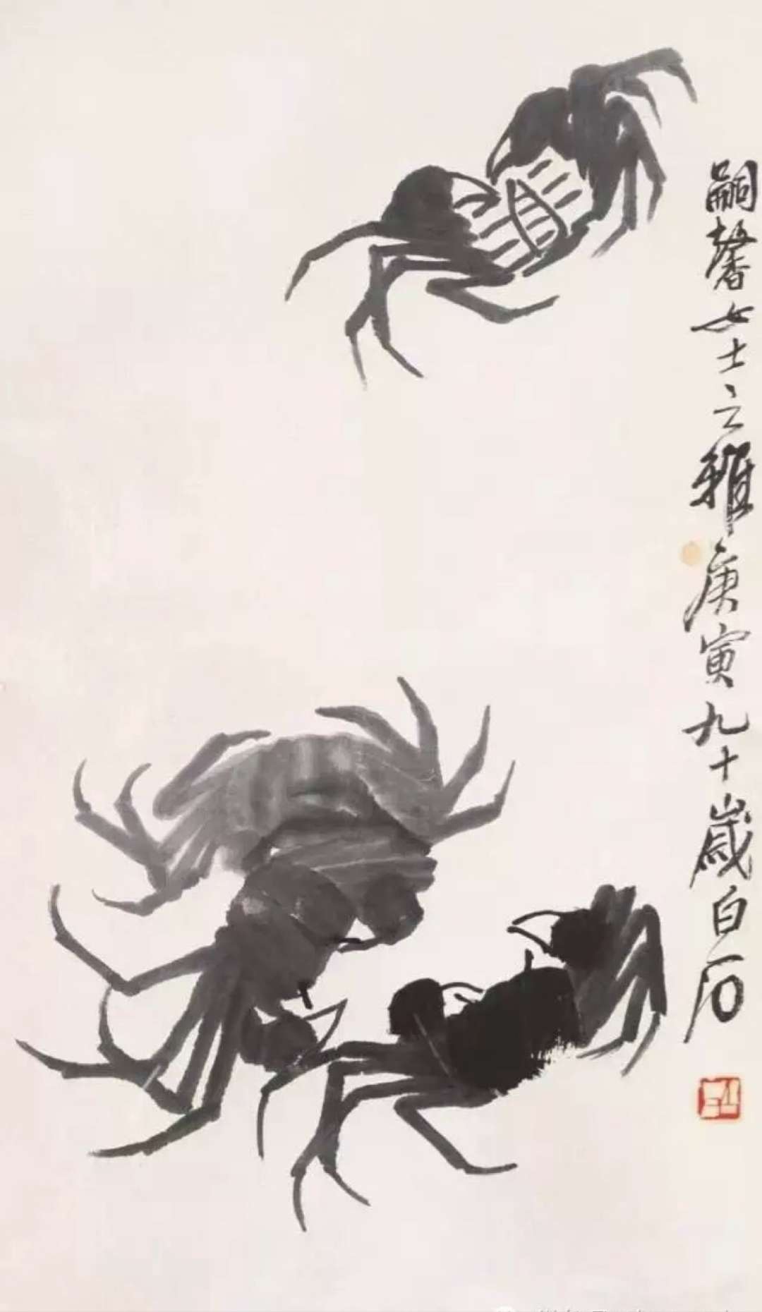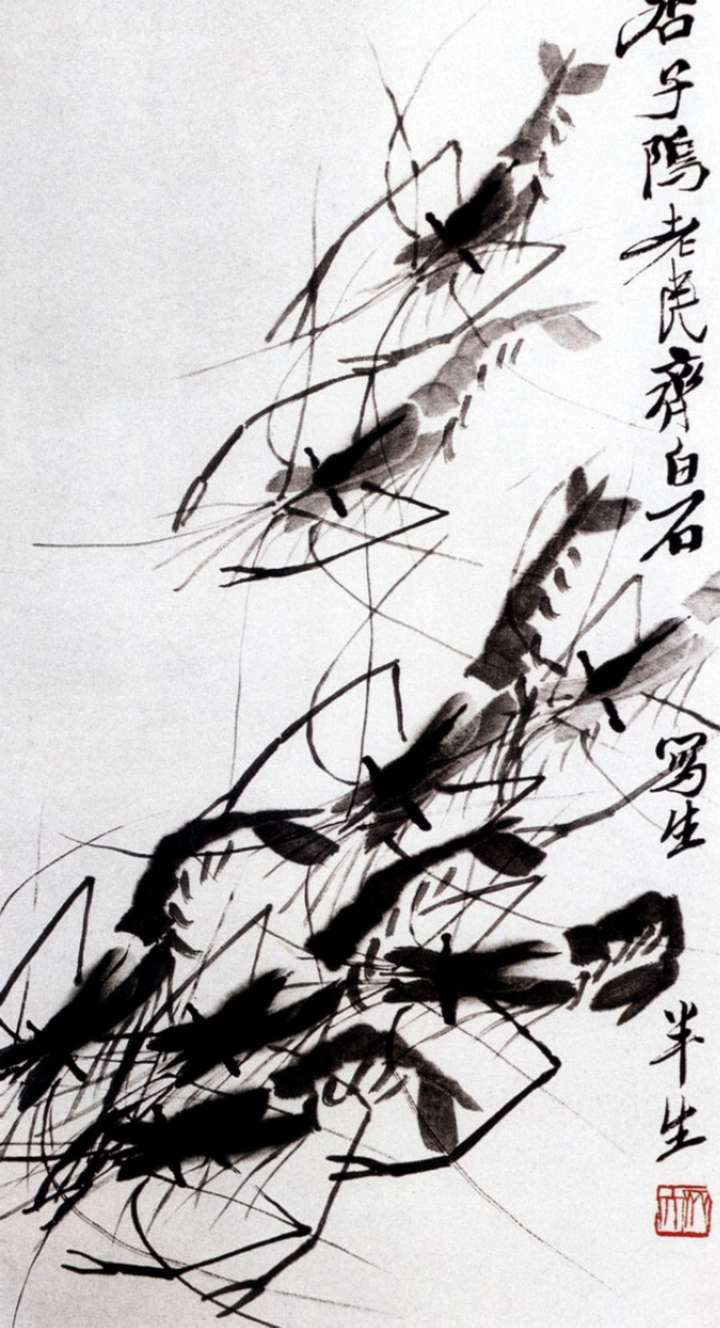 齊白石擅作花鳥蟲魚。畫的蝦更是出神入化,濕漉漉的,宛在水中,靈動活潑,神韻充盈。為了畫得逼真,他在一只大海碗里,養(yǎng)了幾只活蝦,放在案頭。作畫之前,先盯上半天,仔細觀察它們的體態(tài)、顏色、爭斗時的姿態(tài)。然后,研磨鋪紙,作起畫來,不僅把蝦的身體結(jié)構(gòu)表現(xiàn)得細致入微,而且把蝦身體的彈性都表現(xiàn)得充滿力量,其長螯的勁力和觸須的柔順處理得相映生輝。蝦眼和蝦腦上的重筆,干濕用得更是恰到好處,令人叫絕。