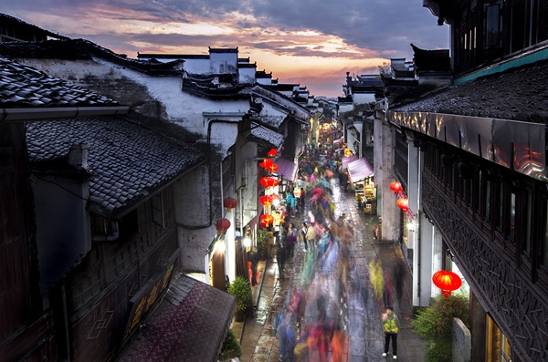徽商造就的屯溪老街是古徽州的商業(yè)重鎮(zhèn),地處屯溪西部的黎陽于公元208年便有縣級建制。悠久的歷史為屯溪留下了包括徽派建筑在內(nèi)的豐厚文化遺產(chǎn)。作為屯溪市重要發(fā)祥地的屯溪老街,是隨著徽商的興起逐漸形成和發(fā)展起來的。元末明初,有婺源、歙縣商人,為方便土特產(chǎn)和食鹽中轉(zhuǎn),在率水、橫江和浙江聚匯的三江口附近,建立棧房,屯聚貨物。明代永樂年間,休寧商人程維宗在此基礎(chǔ)上再建新的店鋪,還在店鋪之間建亭閣,供來往行人休息,從此形成了有一定規(guī)模的屯溪街市。屯溪老街還是蜚聲海內(nèi)外的徽州傳統(tǒng)工藝品的加工、制作、展示、銷售中心。