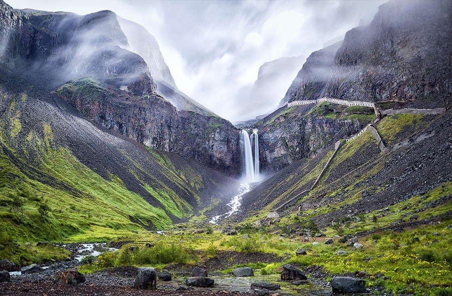 從這里往下俯視就是飛珠濺玉的“濺玉臺”。離開觀景臺,棧道開始變陡。經(jīng)過一段狂瀑,就到達(dá)札嘎瀑布的源頭。