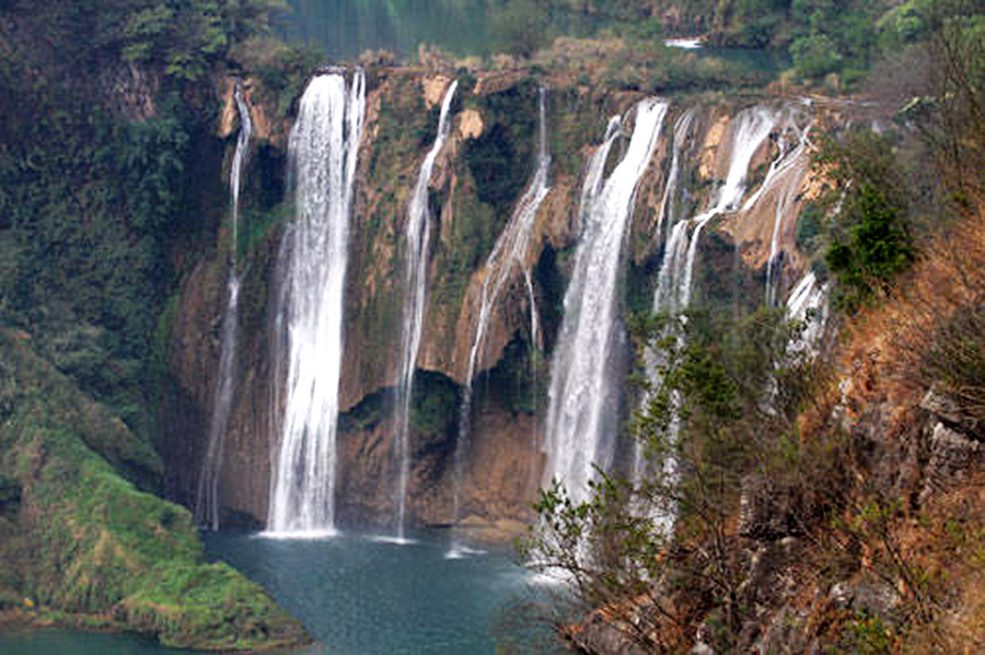 瀑布上游是湖泊,下游是階梯式河床,湖水從巨大的鈣化梯坎上飛速寫速跌落,經(jīng)三級鈣華臺階跌宕而下,沖擊于巨大的鈣華石壁,形成巨幅瀑身,聲聞十里,如戰(zhàn)鼓擂動,如萬馬奔騰。