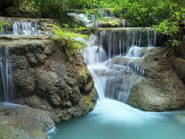 告別迎賓池,沿著曲折的棧道蜿蜒而上,可見到千層碧水沖破密林,順坡而下,在高約10米、寬約60余米的巖坎上飛瀉而來,形成數(shù)十道梯形瀑布,如珍珠流滾落,銀光閃爍;如水簾高掛,云霧蒸騰;如絲般緩流,舒展飄逸;如珠簾閃動(dòng),風(fēng)姿綽約。瀑布后有一座陡崖,多為馬肺狀和片狀鈣化覺積,凝垂欲滴,色澤金黃,使整個(gè)瀑布顯得富麗壯觀。經(jīng)太陽余輝點(diǎn)染,反射出不同的色彩,遠(yuǎn)望如彩霞從天而降,分外輝煌奪目,號(hào)稱“飛瀑流輝”。