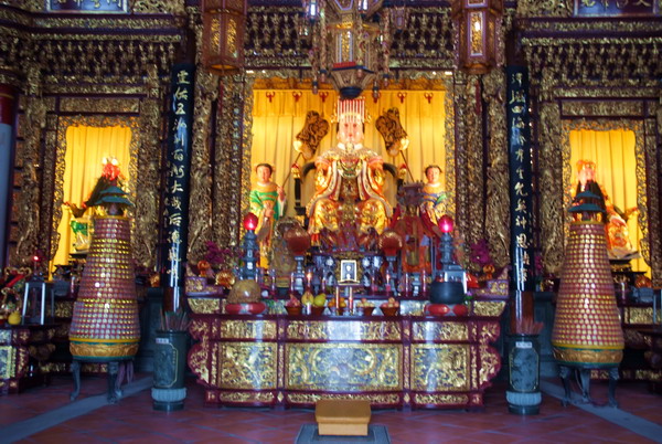 天后宮大殿同樣是木石結(jié)構(gòu),金黃色琉璃瓦屋面配以閩南式燕尾大脊,脊頂以彩瓷塑“雙龍朝寶塔”,飛檐有各色堆剪和卷草花飾,殿前臺(tái)明正面砌六幅青石浮雕,踏步中部嵌一幅“九龍勝云”浮雕御路石,整座大殿外觀氣勢恢宏。版權(quán)所有山東聊城聊之旅國際旅行社有限公司,轉(zhuǎn)載必究!大殿前廊八根圓形透雕青石大龍柱及大量石雕,絳紅色榔扇門窗,繪有大量寓意喜祥如意的圖案。大殿梁柱間的大部分彩繪以媽祖故事為主題,描金厚彩,富麗堂皇。殿內(nèi)供奉一尊高三點(diǎn)八米、寬二點(diǎn)一米的媽祖坐像。