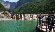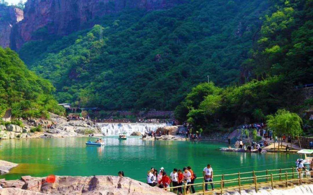 見龍瀑又名潭頭瀑,因其上游的潭頭古村落而得名。見龍瀑布每年限時(shí)開放,猶如見龍?jiān)谔铮ㄖ辉诿磕甏杭境霈F(xiàn))故名見龍瀑。見龍瀑?gòu)暮0?80米的斷崖上跌落到海拔260米的溝底中,落差達(dá)320米,瀑布最大流量可達(dá)3000立方米/每秒,似云龍飛騰,聲威勢(shì)大,氣貫如虹,號(hào)稱‘中原第一瀑’,展示出一幅‘山因水而靈秀,水因山而雄厚’的生動(dòng)畫卷。