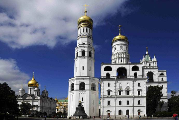 人們從遠(yuǎn)處遙望克里姆林宮,不難發(fā)現(xiàn)有一座建筑高高地矗立在建筑群體中,有鶴立雞群之感。這個高大建筑就是教堂廣場上的伊凡大帝鐘樓。它高81米,是古時的信號臺和望臺。鐘樓的左側(cè)有重達(dá)40 噸的炮王,右側(cè)是著名的鐘王。這兩個龐然大物雖然從未使用過,但卻顯示出了俄羅斯工匠高超的鑄造技術(shù)。