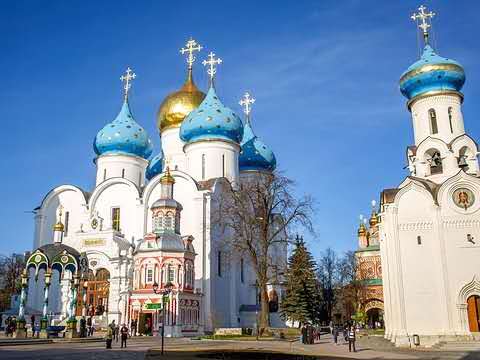 這里可以看到以畫《三位一體》而出名的俄羅斯畫家安德烈·魯布廖夫的壁畫作品等。他的作品《三位一體》本在此教堂收藏,現(xiàn)在收藏于莫斯科的特列季亞科夫畫廊。三圣大教堂的旁邊,是建于1477年的杜霍夫斯基教堂。教堂建筑奇特,由上下兩層構(gòu)成,下層是鐘樓,上屋是觀景臺(tái)。建于1682-1692年的白石磚砌齋房大廳,富麗堂皇,是舉行隆重宴會(huì)的場(chǎng)所。建于1741-1769年的五層鐘樓,高達(dá)88米,內(nèi)有掛鐘42口,是修道院建筑整體中最寶貴的部分,也是俄羅斯最美麗的建筑物之一。位于大修道院中央的圣母安息大教堂是在伊凡四世(雷帝)于1585年命令下修建的。在4個(gè)洋蔥頭型的藍(lán)色圓頂中央,有一個(gè)金色的大圓頂。是仿莫斯科的克里姆林宮的圣母安息大教堂而建的。教堂內(nèi)有l(wèi)7世紀(jì)的壁畫。 1920年,大修道院被列為國家歷史博物館保護(hù)區(qū),存有12-19世紀(jì)的應(yīng)用工藝品和18世紀(jì)的俄羅斯繪畫,還藏有各種民間藝術(shù)品,如木、石、骨雕、壁畫、紙彩畫、刺繡等。這里的圣水可是很有名的,每逢復(fù)活節(jié)、圣誕節(jié)等重大宗教節(jié)日,這里都有一番熱鬧景象。謝爾蓋三圣大修道院內(nèi)設(shè)有莫斯科宗教大學(xué)和神學(xué)院。在這里經(jīng)常能遇到身穿黑袍的年輕的修士和修女。