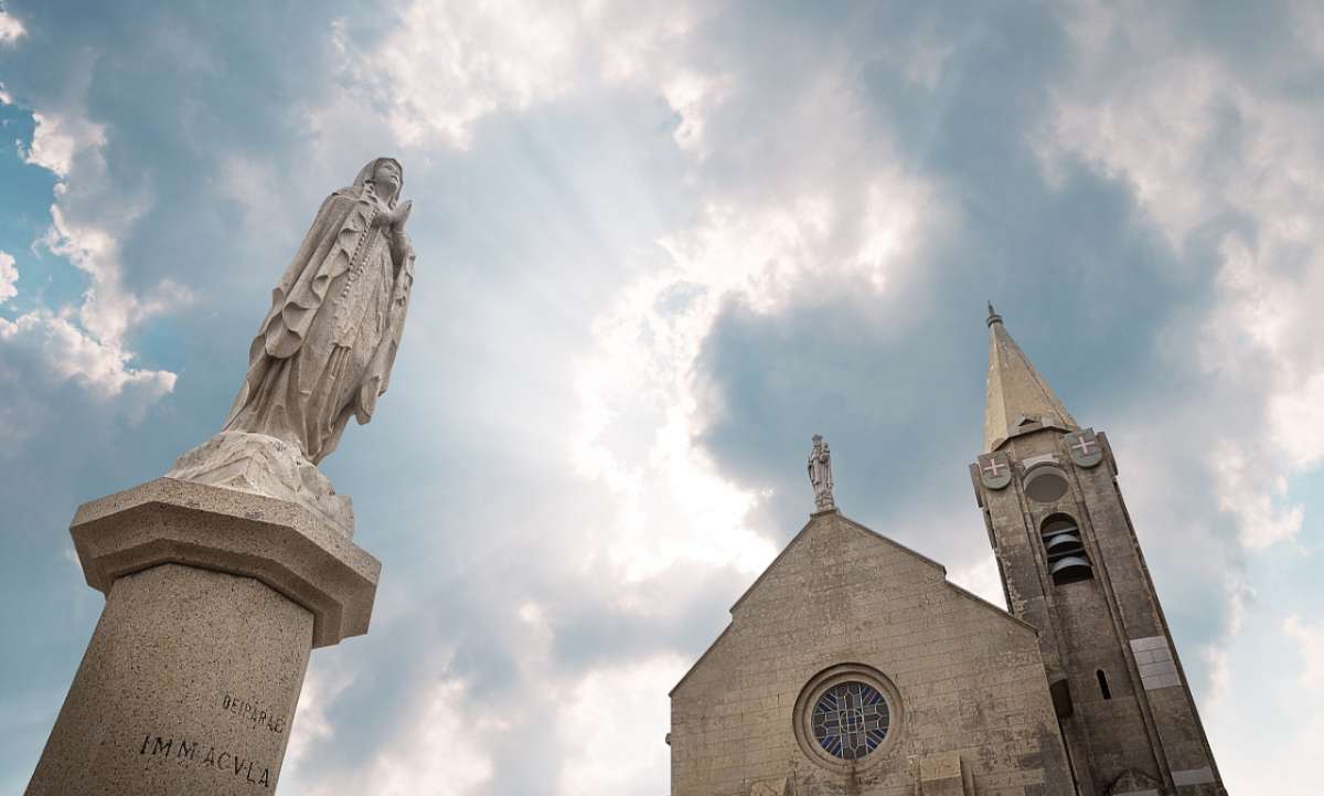 教堂前是一片寬廣平臺(tái),平臺(tái)盡處豎立一尊大理石雕刻而成的圣母像,圣母雙手合十,貌甚慈祥,面臨大海。平臺(tái)下有一路德圣母巖洞,循左右環(huán)抱之石階而下,即達(dá)洞前。版權(quán)所有山東聊城聊之旅國際旅行社有限公司,轉(zhuǎn)載必究!洞內(nèi)巖石嶙峋,中開拱門,內(nèi)立圣母像,象征古時(shí)圣母在法國路德城內(nèi),當(dāng)眾顯靈的情景。其間正置祭壇,洞前有鐵柵圍繞,地上設(shè)有多排低矮的長石板,供教徒跪拜,懺悔。