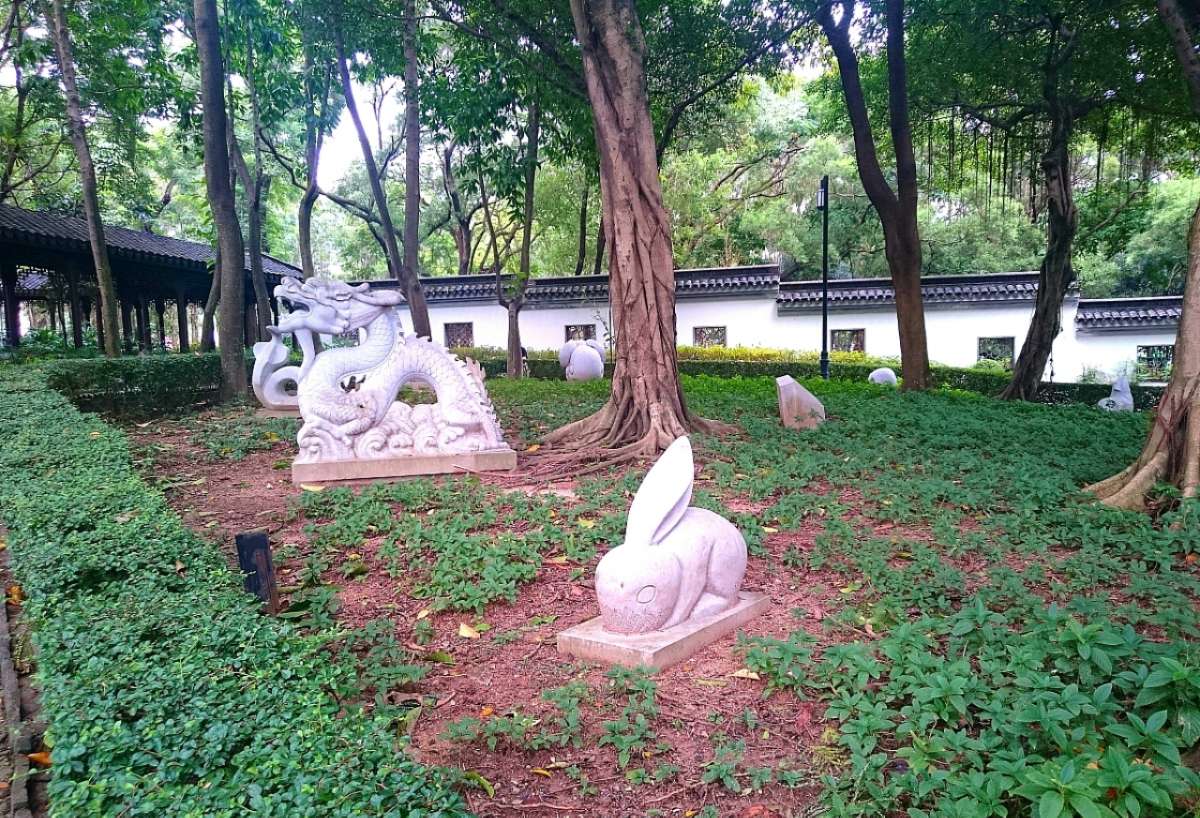 此庭位于衙門西側,布局猶如“園中園”。庭內擺放各式形態(tài)獨特的嶺南盆景,矮樹叢的“龍”、“鳳”造形修 葺得栩栩如生;而地上由卵石、啤酒樽、碗碟碎片鋪砌而成的“五蝠壽鶴圖”則維肖維妙。園內植有四季花卉,置身其中,四時景致盡現(xiàn)眼前,為寨城八景之“四季同馨”。