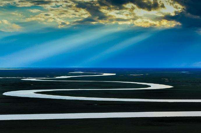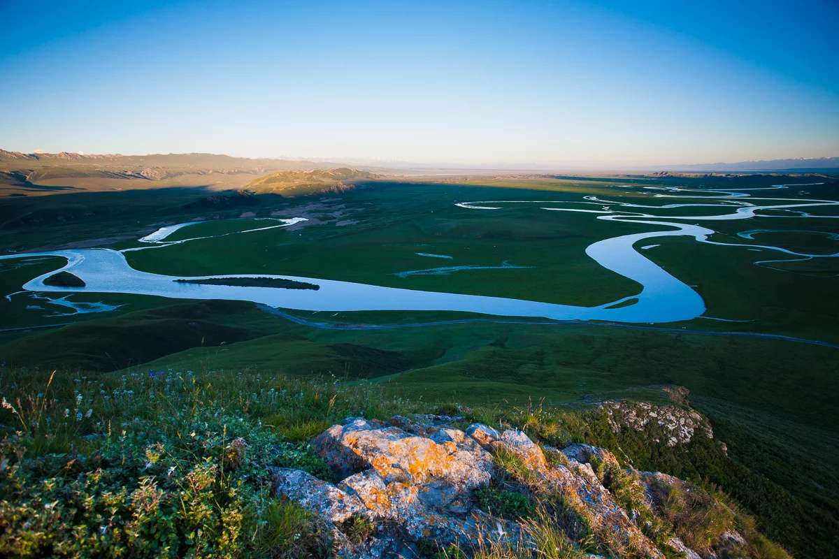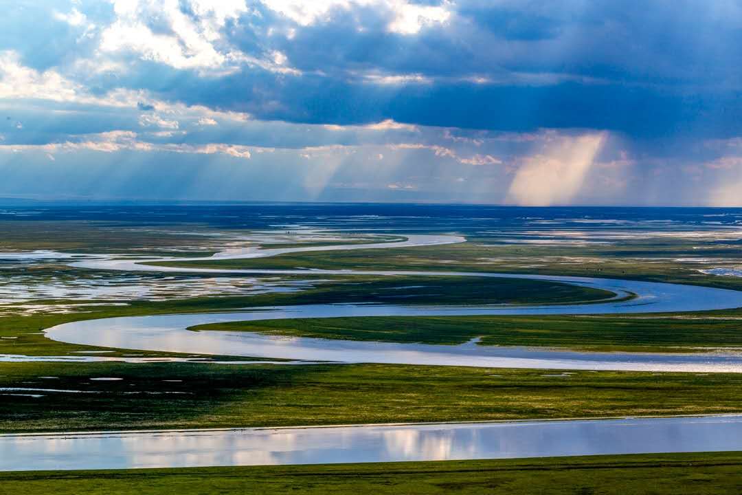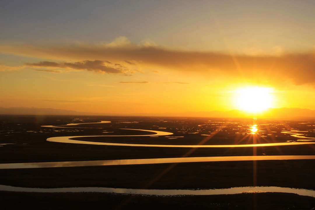 開都河的源頭云霧繚繞,特別是盛夏,云涯水暖,云水難辨,仿佛河水從天而降。開都河上游河流由小尤勒都斯盆地,經(jīng)過(guò)巴音布魯克,到大尤勒都斯盆地,水流平緩,河谷開闊,四周牧草豐茂,是天然的優(yōu)良牧場(chǎng)。特別是在小尤勒都斯盆地平坦遼闊的草原上,開都河蜿蜒流淌,形成九曲十八彎的壯麗景象。那模樣,像一個(gè)大寫的蒙古文字,有一種鬼斧神工的靈氣。