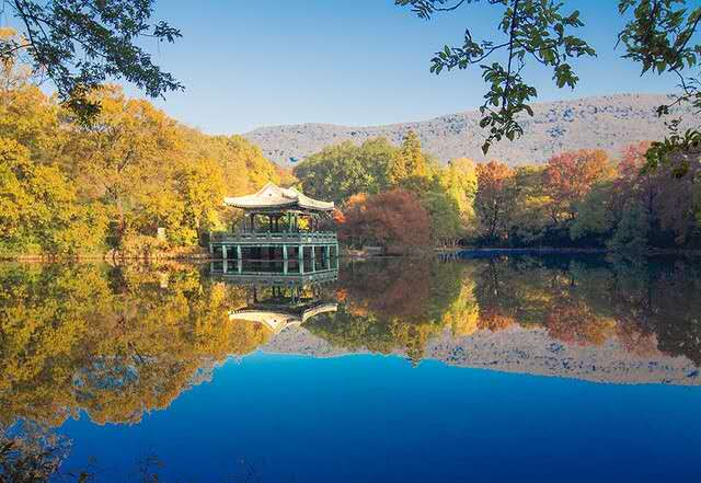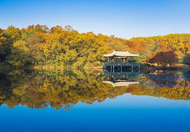 流徽榭又名水榭亭,是南京鐘山風景名勝區(qū)內(nèi)一處景色優(yōu)美的風景點,位于中山陵園,在中山陵至靈谷寺公路的南邊。榭長14米,寬 10米,頂為乳白琉璃瓦,紅色立柱; 三面臨水,碧水如鏡,倒映水榭, 別有情趣。