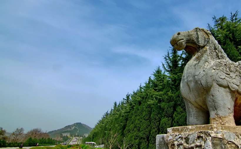 從梁山南二峰的天然雙闕起,往北依次對稱排列。端立首位的是1對高達8米有余的八棱柱石華表,這是帝王陵墓的標志,其造型昭示著生命長存的理念和古代先民對人類生殖行為的崇拜。接著是一對昂首挺胸、渾圓壯觀的石刻翼馬,馬身兩翼雕以卷云紋,似有騰飛之勢。翼馬之北是1對優(yōu)美的高浮雕鴕鳥,是唐王朝同西域人民文化交流與友好往來的象征。緊接鴕鳥的是5對配有馭手的石仗馬和10對高4米左右的石翁仲(或稱直閣將軍)。