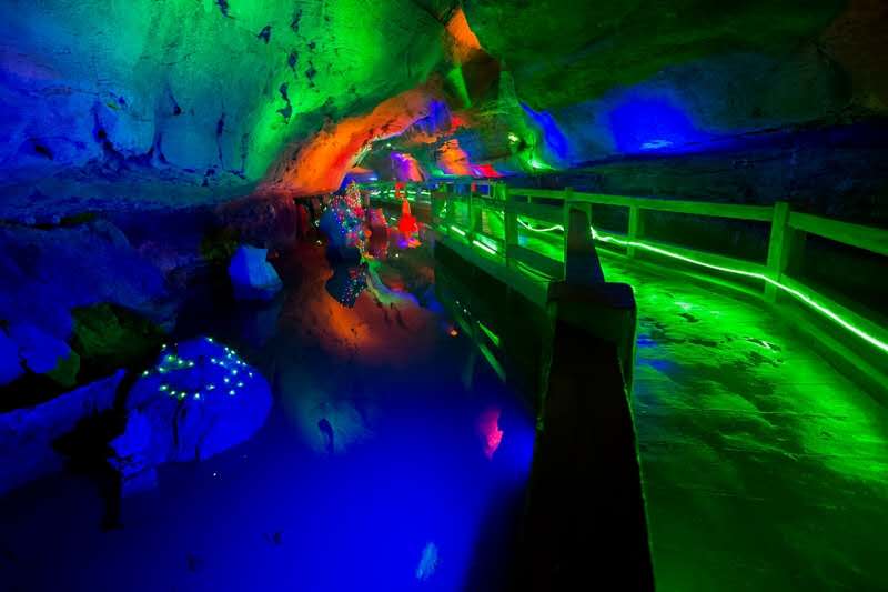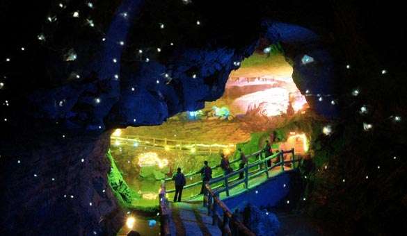 螢火蟲水洞形成于約0.65億年至2.3億年前,全長1200米,是“國家地質(zhì)公園”、國家“AAAA級旅游區(qū)”。洞內(nèi)有湖光山色、星際夢幻、黑洞探秘、幽谷星河、穿越時空等5個景段60余個景點(diǎn)。