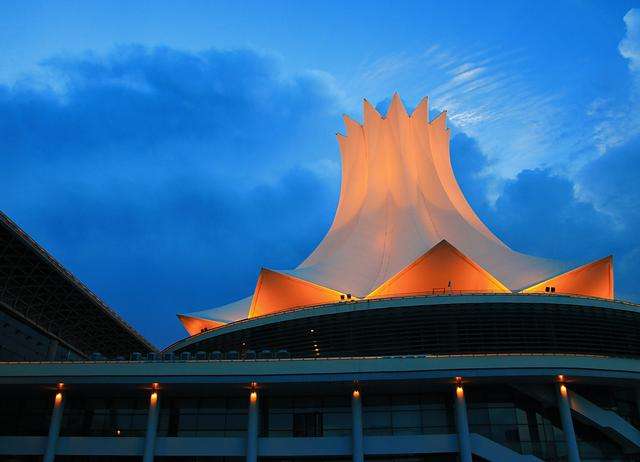 多功能廳的屋頂,就是潔白無瑕的“大穹頂”,它是整個(gè)中心的標(biāo)志,被稱為南寧國際會(huì)展中心的“靈魂”。從多功能大廳往上走可以到達(dá)觀景平臺(tái),在這里不但能俯瞰瑯東美景,更能近距離地觀看和觸摸到這朵巨型“朱槿花”。大穹頂直徑約60米,重達(dá)800噸,以朱槿花為造型,其12片白色的“花瓣”象征著廣西12個(gè)少數(shù)民族,獨(dú)特的造型在國內(nèi)尚屬首創(chuàng)。10月23日晚上,會(huì)展中心全線亮燈,在1000多盞燈具、燈飾不同角度的照射下,大穹頂如同一塊玲瓏剔透的水晶,散發(fā)出與白天完全不同的魅力,其夜景效果不可不看。