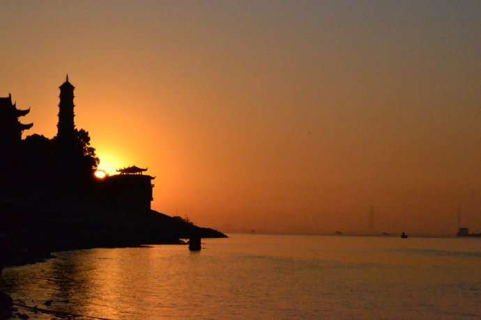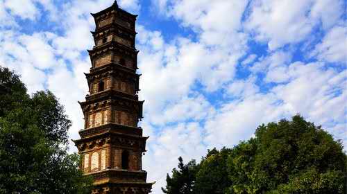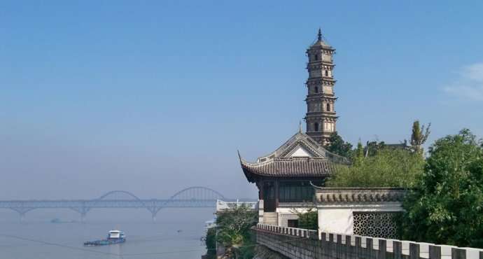 長江之濱,九江市東北隅,傲然屹立,高聳藍天,瀟灑古樸,偉岸氣昂,塔影鎖江,風雅微妙。塔高35米,造就七層,六面錐狀,青磚砌身,石鑿拱頂,宛如撐天大柱突兀江畔。塔內(nèi)原有木梯,沿梯盤上,登臨頂端,極目環(huán)顧,北瞰遠山渺黛,南視古城幽雅,仰觀藍空蔚媚,俯看碧江波粼,正如當年懸掛在此對聯(lián)所云:“百荻波光當岸繞,黃梅山色過江來?!笔菫闈£柺爸?。此處原系一回龍磯,江岸突起躍出江面30余米,流水至此漩轉(zhuǎn)激湍,常有行船在此處遭難。
