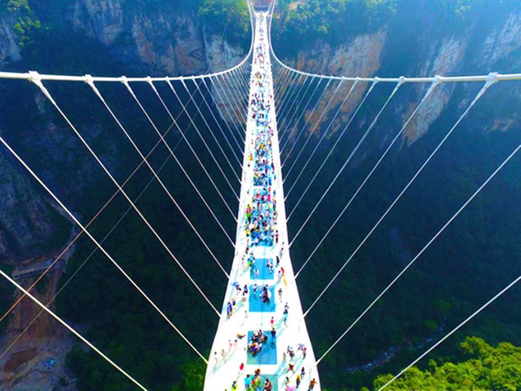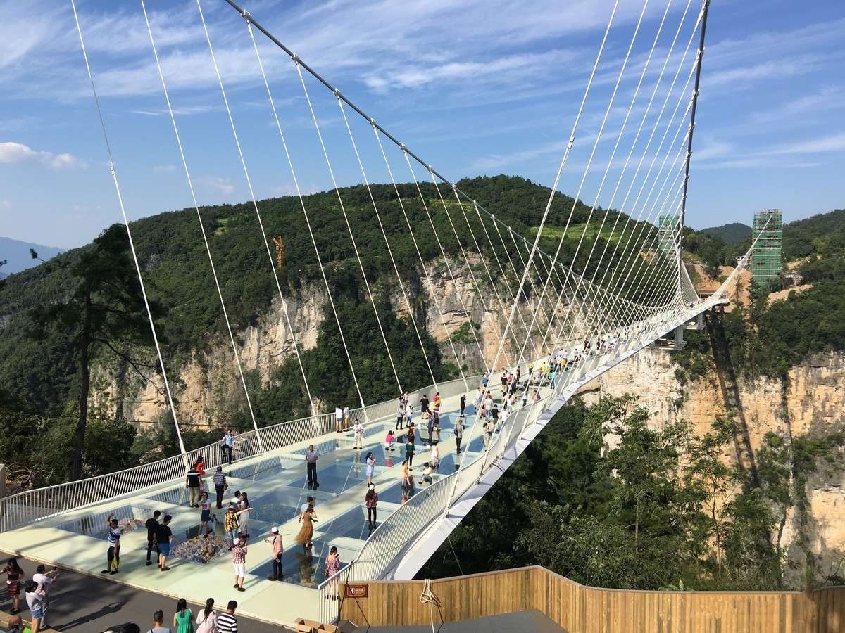 云天渡所處地形懸崖溝谷、崗巒起伏、陡峭險峻,場地屬于原始巖溶地貌,地質條件復雜。因地處喀斯特地貌區(qū)域,建設者們在前期巖體第三次施工鉆探中發(fā)現玻璃橋一端主塔下方80米深處有溶洞,會嚴重威脅橋梁安全;玻璃橋最終延伸60米,橋面拓寬2.8米,以增強橋的安全系數。版權所有山東聊城聊之旅國際旅行社有限公司,轉載必究!橋梁設計和施建方面,克服建筑選材、玻璃工藝、抗風防滑、抗震減振、抗壓抗凍等多項技術難題, 玻璃采用高強度航天復合材料, 具有大尺寸、高硬度、高厚度、耐磨、防凍、超純凈、防爆、高荷載、防霉、防溫度劇降、脆性玻璃與柔性橋結合等諸多特性。