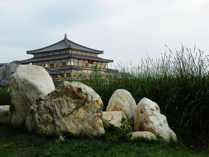 沿著唐城墻遺址走到東南角,就是曲江池遺址公園的西入口。舉目遠(yuǎn)眺,能看到湖心仙島,波光中依仙島而設(shè)的荷廊恰似一朵盛開(kāi)的水蓮花。若是向更遠(yuǎn)處,能望到閱江酒樓在曲江池南岸的柳色掩映中,酒旗招展似乎要引得游人快步,而重重柳堤、香花和池水卻致人流連漫步。性急的游客,這時(shí)候也可以直接駕車取曲江池西路直接繞到公園南口進(jìn)酒樓,然而這未免饕餮了一路由北向南的盛景。