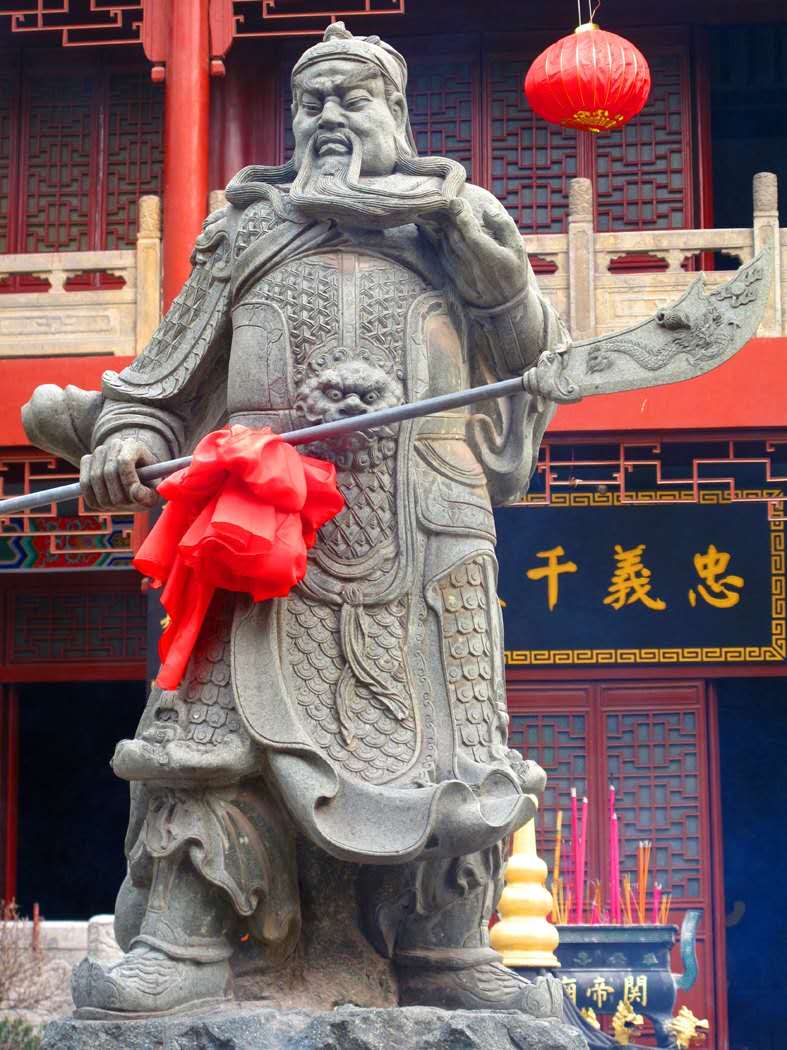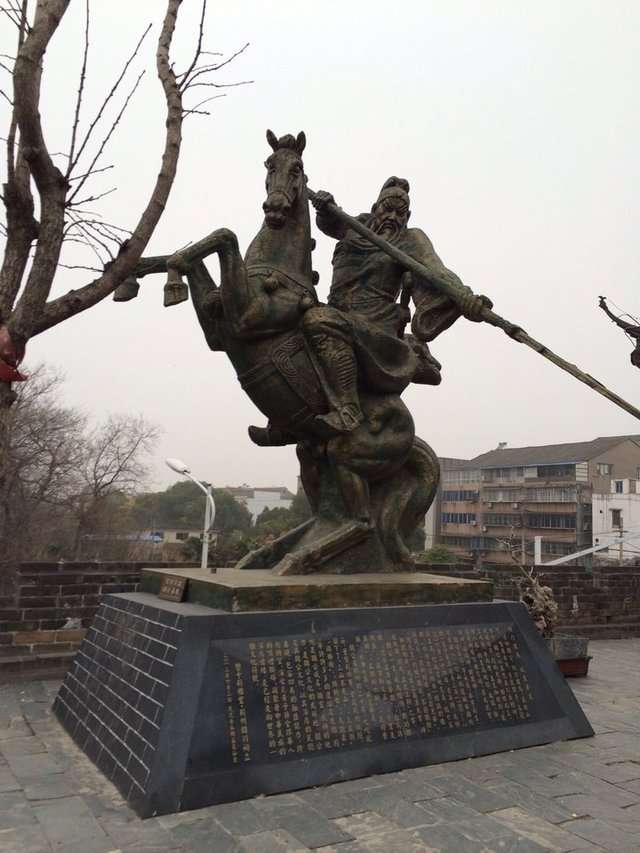 山上立有一尊花崗巖立姿石像,高4.8米。關(guān)公面朝東方,握刀遠(yuǎn)眺,威儀凜然,似乎在訴說:我回來了。我回來了/撣去戰(zhàn)袍上的征塵/耳邊還激蕩著戰(zhàn)場的吶喊/跨越歷史的長河/又回到了這片我厚愛的熱土/我回來了/曾經(jīng)啊/在這里/我指點(diǎn)江山/笑傲群雄/鄙視過魏曹/怒罵過吳孫/揮青龍跨赤兔送那大江洶涌東去/我回來了/仿佛一夜夢醒/彈指千百年過去/躍下穿過狼煙烽火的戰(zhàn)車/欣然步入這和諧的盛世/我回來了/象遠(yuǎn)征凱旋歸來的大帥/巍然屹立在雄偉的古城/細(xì)細(xì)品味逝去的歲月/腦海里澎湃著未來的輝煌。