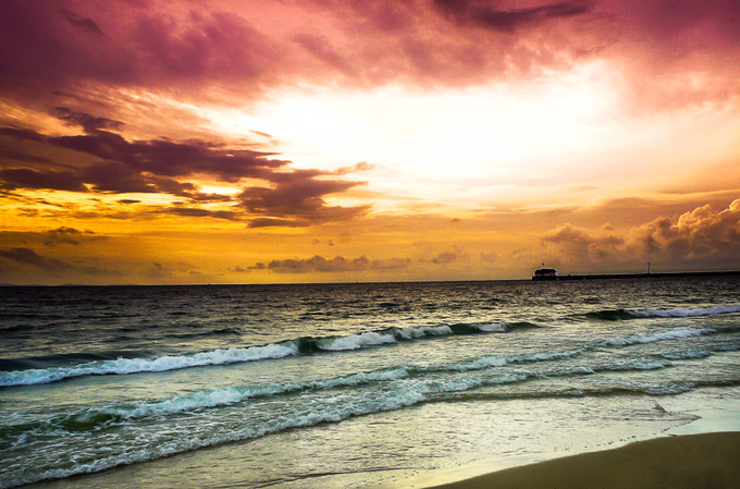位于西哈努克城的西北角,勝利海灘超過(guò)2公里長(zhǎng),被礁石和小山分成兩段。其北段有大貨船來(lái)來(lái)往往,這里游客較多,是西哈努克看日落的最好地方,南段又稱夏威夷海灘、國(guó)王海灘,可在此租船出海。