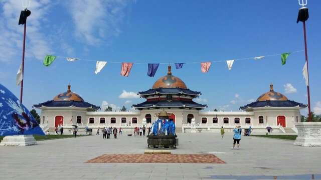 可在市區(qū)乘坐1路, 在市醫(yī)院站下車,步行至成吉思汗廣場(chǎng)。