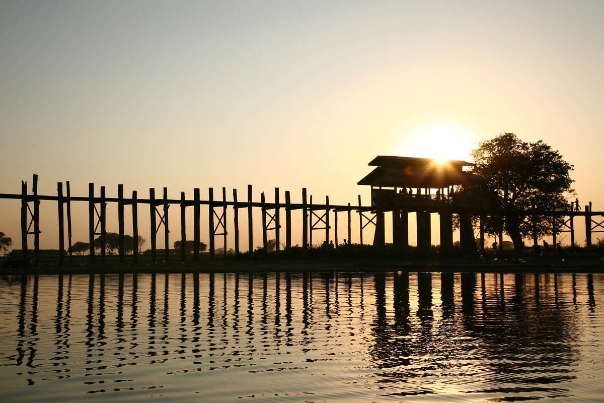 烏本橋建于1851年,長1200米,全橋完全由柚木鉚合而成,是世界上最古老和最長的柚木結構橋。橋柱與橋柱之間相距3米遠,橋柱有1000多根。整座橋相接處沒有使用一顆鐵釘,全靠斗榫。這座橋已經(jīng)歷經(jīng)150年的風風雨雨,但是依然結實。
