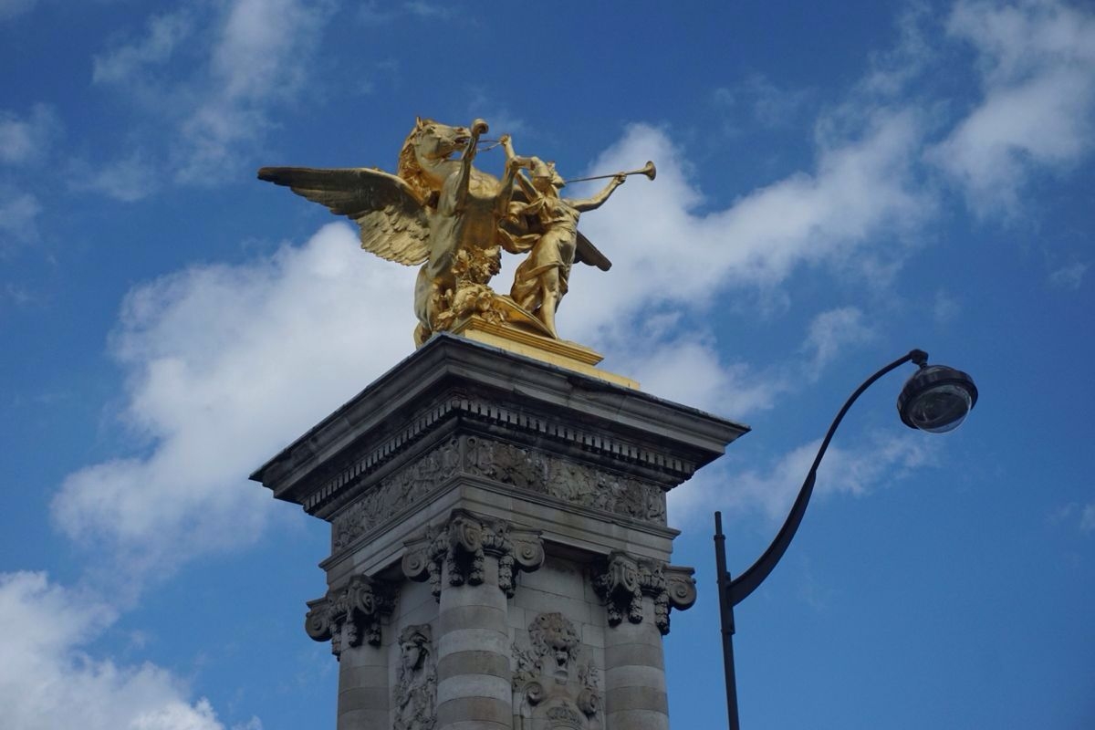 亞歷山大三世橋為全金屬結構。大橋將香榭麗舍大道及云斯頓 - 丘吉爾大道 (Av.W. Churchill) 兩側的 1900 年世博會的大小兩個展館(Grand Palais & Petit Palais)和塞納河南側的榮軍院連接起來。橋長107米,寬40 米,橋兩端各有兩座高17 米的橋塔。塔頂有象征著科學,藝術,工業(yè)與商業(yè)四組金色的駿馬雕塑。它們即使在陰雨的天氣里也都金光閃閃,富麗堂皇。無論從塞納河的游船上還是艾菲爾鐵塔上都可以清楚地看到。