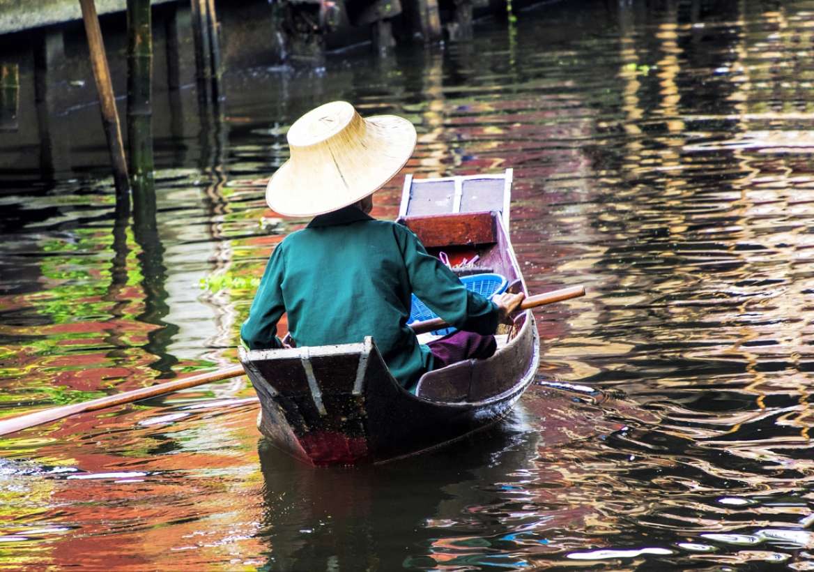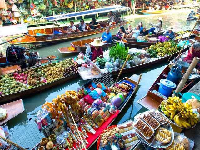每天早上約7點到9點,是當?shù)厝私灰鬃铑l繁的時候,會有一艘接著一艘的小船從附近駛來,賣時蔬水果、干貨、小吃、鍋碗器皿、草帽等,在船上煮米粉、剖椰子都是輕而易舉的事情。店家各持一艘船,景象實在壯觀。約莫10點左右,除了小販的船外,更多了載觀光客的船,有時河道可能也會被擠得水泄不通,出現(xiàn)難得的「塞船」景象,不過這里有水上警察吹哨音指揮,紓解交通,很快就能讓河面再度活絡起來。
