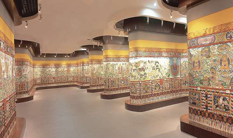 青海藏醫(yī)藥文化博物館整體結(jié)構(gòu)共分三層。一、二層設(shè)有藏醫(yī)史、曼唐器械、古籍文獻(xiàn)、藏藥標(biāo)本、天文歷算、彩繪大觀等六大展廳;負(fù)一層建有班智達(dá)藏藝展銷精品城。各大展廳根據(jù)不同的展示內(nèi)容,通過環(huán)境再現(xiàn)、唐卡雕塑、文物展示、高科技模擬等方式和手法,突出特點(diǎn),各具風(fēng)格,展示了中國藏醫(yī)藥文化博大精深的豐富內(nèi)涵。
