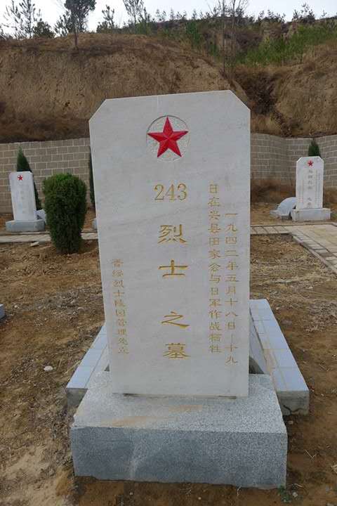 正面朝北、東西走向的深紅色大理石陵墓上,稍靠西側(cè)陳設(shè)著鋼盔和軍旗的青銅雕塑,造型簡(jiǎn)潔明快,蘊(yùn)意肅穆深長(zhǎng)。墓前有一個(gè)凸型五星狀的火炬,五星中央噴出的火焰,從建成時(shí)一直燃燒,從未熄滅,它象征著烈士的精神永遠(yuǎn)光照人間。
