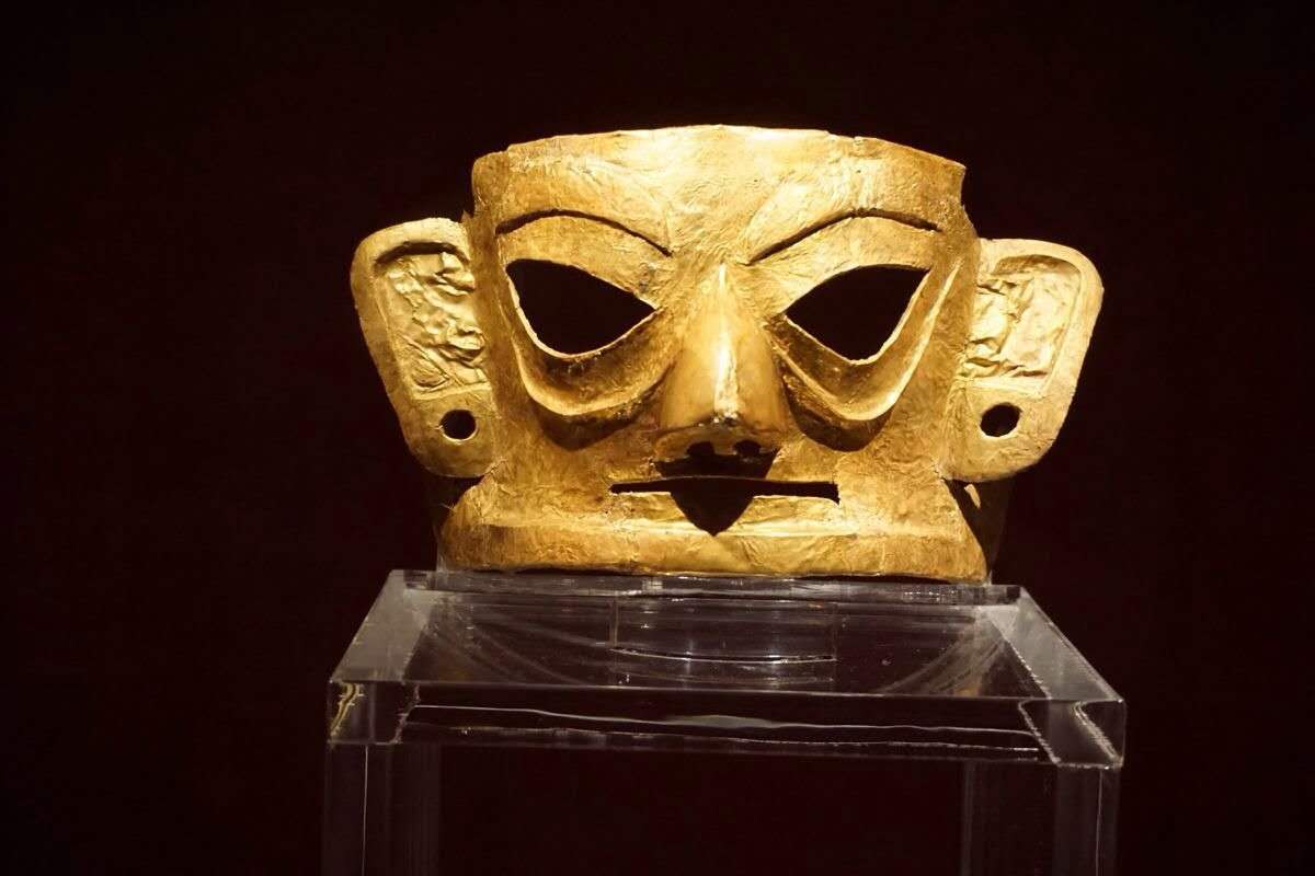 黃金面具寬19.5厘米、高11厘米、厚0.04厘米,重46克。其造型與小金面具有所不同,整體呈立體臉譜,表現(xiàn)范圍上限于額部,下方及下頜。面相近方,平額,眉毛略微凸起,中央寬而兩端收束,好似新月。眼眶較大,雙眼鏤空約呈菱形,上眼簾呈弧形,下眼簾深凹。鼻梁高直,鼻翼與顴骨線相連。嘴巴鏤空呈扁長方形,略呈笑意。耳朵外展,上寬下窄,耳垂穿孔。嘴巴微張,呈狹長方形,下頜平直。整個臉部豐滿,表情威嚴,具有一定寫實風(fēng)格。從金面具背面的痕跡觀察,推測此器可能是附著在某種物體之上,應(yīng)是古蜀時期的神祗面具。此件面具與三星堆遺址一、二號坑中出土的青銅人頭像、青銅人面具在造型風(fēng)格上基本一致,再次證明了金沙遺址與三星堆遺址有著緊密的承襲關(guān)系。
