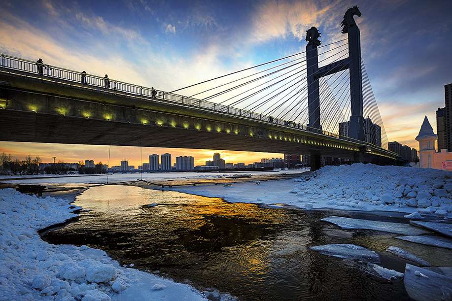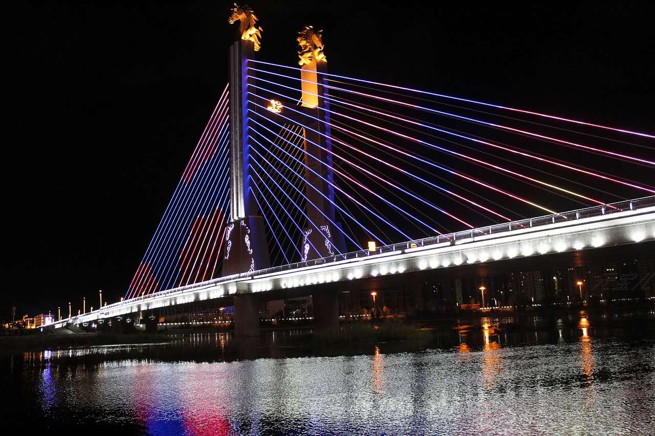 大橋全長944米,寬28.6米,主塔高56.5米??偼顿Y1.4億元,東起海拉爾和平大街,橫跨伊敏河,西至東大街,是內(nèi)蒙古自治區(qū)第一座大跨度雙索面獨塔斜拉橋。版權(quán)所有山東聊城聊之旅國際旅行社有限公司,轉(zhuǎn)載必究!大橋設(shè)計精湛,風格獨特,融建筑藝術(shù)與民族文化于一體,堪稱海拉爾橋梁建設(shè)的典范。