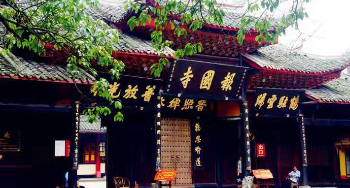 山門的“報國寺”大匾,是清康熙皇帝御題,王藩手書。正殿懸有“寶相莊嚴(yán)”匾。山門兩邊柱上那副對聯(lián)“鳳凰展翅朝金闕,鐘磬頻聞落玉階?!本褪菍髧逻@只“金鳳凰”周圍景物的生動描寫。橫匾“普照禪林”和“普放光明”,同是一個意思:佛教稱峨眉山為“大光明山”,晝有神奇的佛光出現(xiàn),夜有萬盞圣燈來朝,全峨眉山都被光明普照。右邊“鶴駐云歸”,意為鶴停下了,云歸山岫,喻指清涼靜地,含有道家韻味。大門上的聯(lián)語:“獨思喻道,敷坐說經(jīng)?!鼻罢呤钦f靠自己的思維明白佛經(jīng)的道理,就是佛學(xué)講的“獨覺”境界。后句是說高僧大德鋪設(shè)好法座向弟子講經(jīng)說法。