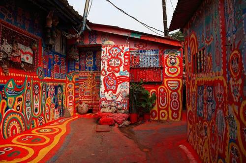 起源于住在臺中市南屯區(qū)嶺東科技大學附近有一處舊眷村的八十七歲老榮民黃永阜,因為「無聊」而拿起畫筆彩將眷村內的巷弄街道當成了天然的畫布,在上頭彩繪了各式美麗的彩虹線條與可愛動物,不僅染亮了小村,在網路上引起熱烈討論,更形成一股參訪風潮。黃永阜先生86歲時開始作畫,他用自己手中的畫筆在眷村老舊的房屋和街道上勾勒出一個色彩斑斕的童話世界。老人最初只是在自家的屋里屋外用畫筆描繪心事,打發(fā)時光。后來不少鄰居被他充滿童真的畫所吸引,也邀請他去作畫,就這樣老人在無意中創(chuàng)造了一段色彩繽紛的傳奇。如今,他所居住的位于臺中市春安里的眷村被人們賦予了一個好聽的名字:“彩虹眷村”,并成為了當?shù)氐臒衢T景點,每年吸引約50萬人前來參觀,而香港籍退伍老兵黃永阜則被人們親切地稱為“彩虹爺爺”。走進“彩虹眷村”,地面上、墻壁上畫滿了色彩艷麗、造型俏皮的兔子、小雞、猴子、小鳥、卡通人物、花朵、太陽以及彩虹等。紅色、黃色、藍色、綠色、白色,絢爛的色彩和極富想象力的線條,讓人們馬上置身于童話世界中。村口那條數(shù)十米長的巷道是“彩虹爺爺”作畫最多的地方,也是最熱鬧的地方。這里的畫色調明艷、熱烈,地上用油漆涂成了紅底,上面用白色和黃色等勾勒出小鳥、小雞和兔子等造型;墻上則分區(qū)塊時而以藍色為背景、時而以白色或黃色為背景,上面畫了數(shù)百卡通造型的猴子、貓和孩童。