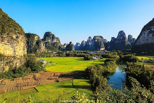 明仕田園位于靠近中越邊境的廣西省崇左市大新縣堪圩鎮(zhèn),距離南寧210公里,距離著名的德天大瀑布37公里。由于明仕田園距離大海不遠,又位于北回歸線以南的熱帶地區(qū)。這里一年四季高溫多雨,以石灰?guī)r為主體的山脈很容易受到水的侵蝕,大自然就以自己的偉力雕塑了明仕田園的喀斯特地貌。在大自然無聲寂靜的歲月流逝中,明仕田園的山總是傍著水,水總是環(huán)繞著山,山總是點綴著水,水總是倒映著山,形成了處處奇峰、山水相映的中國山水。有人放言,在名仕田園沒有真正的攝影家,因為隨便一拍,皆是風(fēng)光迤邐的水墨山水。