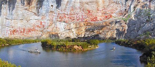 廣西左江流域的寧明、龍州、崇左、扶綏、大新、天等、憑祥等縣市的沿江地區(qū)都分布有崖壁畫,共79處,這些崖壁畫多集中在江河轉(zhuǎn)彎處寬大、平整、垂直壁上,陸地石壁和洞穴也有少量分布,花山崖壁畫是其中規(guī)模最大的,全幅畫長135米,高44米,分布在寧明縣明江耀達河段的花山崖壁上,畫有朱紅色人物1300多個;最大的高達3米,最小的僅0.3米,間有少量獸類和器具,規(guī)模宏大,內(nèi)容十分豐富。所畫人物有雙腳“八字”蹲、兩手上舉和雙腳下彎、兩臂前撐等姿態(tài)。每組畫中,常見一高大的人位于人群中央,腰佩刀劍,旁邊有銅鼓、狗和馬等形象,似是作戰(zhàn)會師、慶祝大會或集體娛樂等場面。據(jù)專家考證,這些崖壁畫繪制于戰(zhàn)國早期至東漢之間,是壯族先民通過圖騰崇拜以祈求五谷豐登、人丁興旺,其線條粗擴,造型古樸,歷經(jīng)數(shù)千年風(fēng)雨侵蝕,依然清晰可見,不僅在廣西,在世界上也極為罕見。