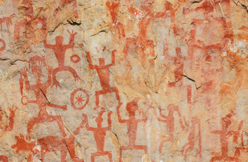 這些圖像在崖壁上錯綜呈現(xiàn),組成一幅幅完整的圖畫——典型的組合是一個高大魁偉、身佩刀劍的正身人像居中,腳下有狗,身旁有銅鼓,四周有眾多動作一致的側(cè)身人像。整個場面布局規(guī)整,疏密相間,動感十足,極像一場莊嚴又歡快的祭祀活動。這些色彩鮮艷、不斷重復(fù)的畫面,與山崖、河流和臺地共同構(gòu)成了神秘而震撼的文化景觀,被稱為“崖壁畫的自然展覽宮”、“斷崖上的敦煌”。
