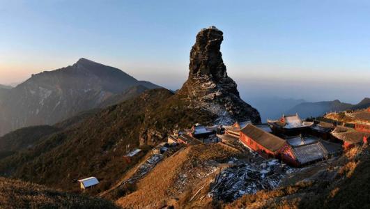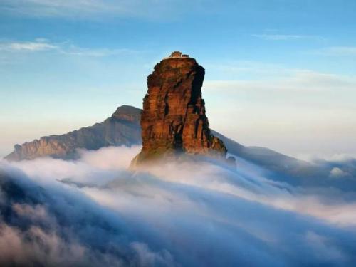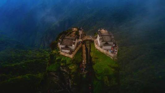 紅云金頂:山峰拔地而起,垂直高差達百米。上半部分一分為二,由天橋鏈接,兩邊各建一廟,一邊供奉釋迦佛,一邊供奉彌勒佛。由此印證現(xiàn)代佛(釋迦牟尼)向未來佛(彌勒佛)的交替。晨間紅云瑞氣常饒四周,人稱紅云金頂。