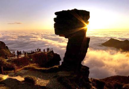 老鷹巖:梵凈山頂一塊似鷹嘴的巖石,這是一方聳立在山巔的巨石,其形狀像一只神情嚴視,展翅欲飛的天鷹,屹立于山巔。 |