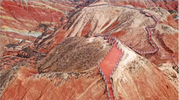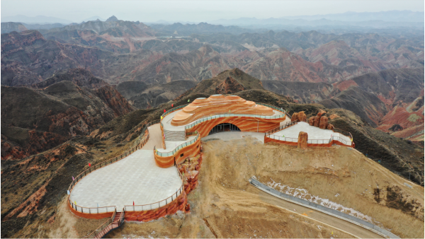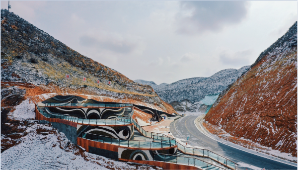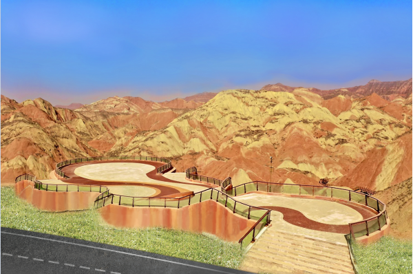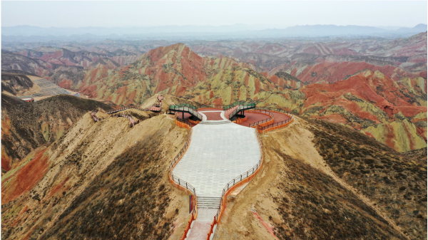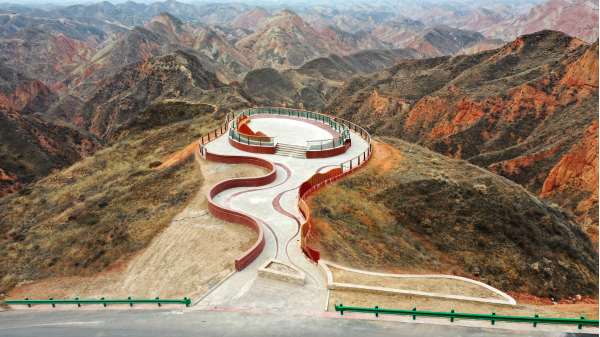 九色丹青觀景平臺九色丹青觀景平臺海拔1748米,平臺的造型宛若一把琵琶橫鋪在丹霞崖壁之間,遠遠望去,渾然天成。這里彩色的千巖萬壑仿佛觸手可及 ,色彩斑斕的丘陵仿似上帝的調(diào)色板,富含石青、石綠、朱砂、白堊、黃赭石等三十余種礦物質(zhì)的巖石在陽光的照射下,各種色彩濃烈地交織在一起,色調(diào)或如波浪順著山勢起伏,或從山頂傾瀉而下,山形肌理狀若潑墨山水,美不勝收。
