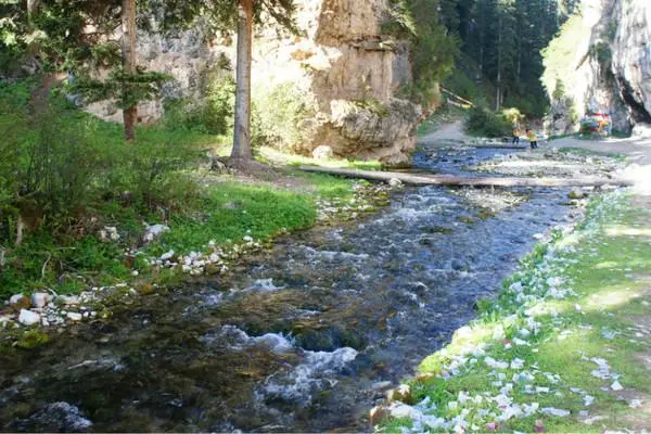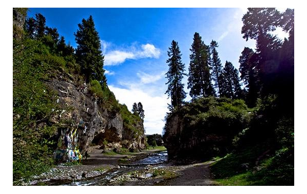 沿湖岸款步前行,越來越窄,轉(zhuǎn)過峽谷就看到小溪的源頭了,源頭從崖兩邊幾眼泉眼中潺潺涌出,清清淺淺地淌在碎石灘下,你不妨喝上兩口,這可是自然界中的純凈水,源頭之水,喝了會讓你感到一股沁人心脾的感覺。當(dāng)?shù)匕傩展苓@泉水叫“乃溪”(圣水),是白龍江的源頭。此泉冬暖夏涼,天旱不枯,暴雨不澇,四季清澈見底。站在石灘上向左上方看去,在險峻的山坡上有一個洞穴俯視著泉眼,居高臨下,虎踞雄威,這就老虎洞。傳說這峽谷曾住著一條善良的白龍在此修道。有一年,山谷中突然發(fā)生了一場大火,大火蔓延,燃?xì)Я藰淞趾颓f稼,百姓無家可歸。正在修練的白龍見狀,想去拯救百姓,可神靈卻把它困在了巖石下,急得白龍渾身發(fā)抖黯然淚下,兩眼涌出一串串淚珠,淚珠沖破巖石,撲來了大火。從此這兩眼泉水再沒有間斷過,得救的百姓為感謝白龍的4恩德,便把從這泉眼中流出的河取名“白龍江”。從那以后,白龍江兩岸林木茂盛,人畜興旺。然而好景不長,一頭白額大虎常常從森林中出來傷害生靈。人們死的死,逃的逃,非常凄慘。一天,惡虎正在窮追來不及逃散的人們時,空中飄來一位慈祥的“仙女華爾旦納摩”,她用智慧降伏了惡虎,并把老虎關(guān)在石洞內(nèi),讓它日夜守護(hù)在白龍江源頭。人們過上了安居樂業(yè)的生活,而仙女“華爾旦納摩”因私自下凡而回不了天庭,就住進(jìn)了仙女洞。從此這地方便有了“達(dá)倉納摩”這個美麗的名字。(藏語中虎穴叫“達(dá)倉”,仙女叫“納摩”)。連后來的格爾底寺也有“達(dá)倉納摩寺”之稱。