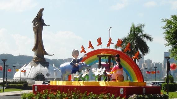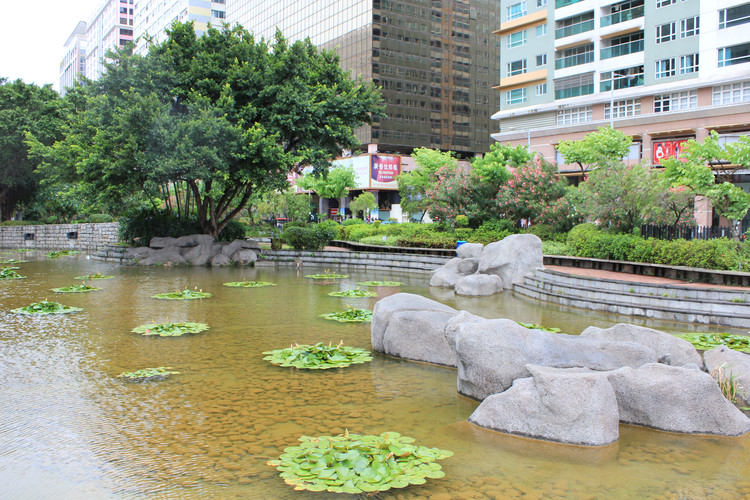 填海區(qū)盡頭對開的人工島上建有觀音像。園內(nèi)環(huán)境優(yōu)美,種滿棕櫚樹和灌木。公園的一側(cè)設(shè)有音樂噴泉,其水柱造型、組合千變?nèi)f化;另一側(cè)為荷塘拱撟,撟下池水清澈,有鴨子和錦鯉於水中嬉戲,一派悠然自得與人同樂的景象。