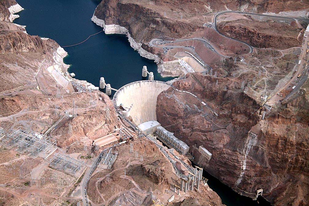 胡佛水壩(Hoover Dam)是美國(guó)綜合開發(fā)科羅拉多河(Colorado)水資源的一項(xiàng)關(guān)鍵性工程,位于內(nèi)華達(dá)州和亞利桑那州交界之處的黑峽(Black Canyon),具有防洪、灌溉、發(fā)電、航運(yùn)、供水等綜合效益。 大壩系混凝土重力拱壩,壩高221.4m,大壩形成的水庫(kù)叫米德(Mead)湖,總庫(kù)容348.5億立方米,水電站裝機(jī)容量原為134萬(wàn)kW,現(xiàn)已擴(kuò)容到208萬(wàn)kW,計(jì)劃達(dá)到245.2萬(wàn)kW。于1931年4月開始動(dòng)工興建,1936年3月建成,1936年10月第一臺(tái)機(jī)組正式發(fā)電。