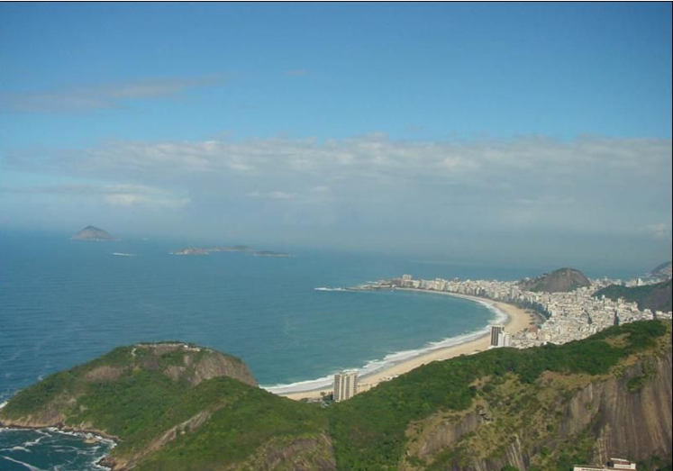 遠(yuǎn)處,一條長(zhǎng)龍飛架海灣兩岸,那是著名的尼泰羅伊大橋。這座大橋全長(zhǎng)十四公里,把里約與對(duì)岸的尼泰羅伊市連結(jié)在一起;這一邊是浩如煙海的大西洋,波光粼粼的海面上不時(shí)地駛過巨大的海輪,三三兩兩形狀各異的小島在海浪潮水的拍擊下,時(shí)隱時(shí)現(xiàn)。遠(yuǎn)處,科帕卡巴納海灘像一彎新月,橫臥在大西洋身旁,五顏六色、南來北往的小汽車宛若無數(shù)的甲殼蟲在月牙般的海濱大道上緩緩爬行……