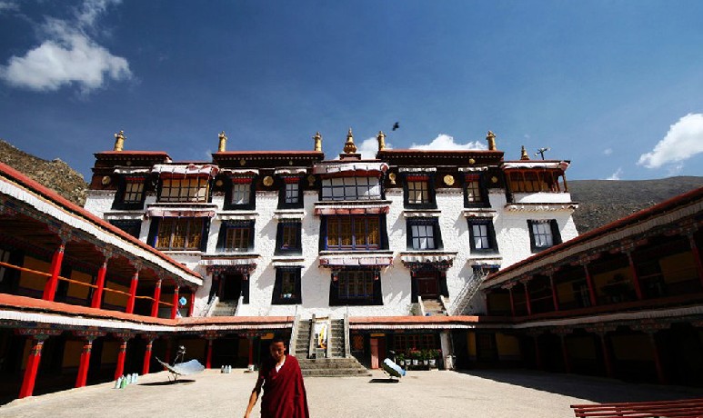樓高3層,平頂宮堡式建筑,恢宏壯麗。殿內(nèi)供有藏傳佛教格魯派創(chuàng)始人宗喀巴大師等人佛像,陳設(shè)豪華,供器甚多。明崇禎十五年(1642年),和碩特蒙古首領(lǐng)固始汗支持達(dá)賴五世打敗藏巴汗后,建立了格魯派統(tǒng)治政權(quán),其政權(quán)機(jī)構(gòu)即設(shè)于此。直到清順治五年(1648年)布達(dá)拉宮白宮建成,達(dá)賴五世由該處移居布達(dá)拉宮,政權(quán)機(jī)構(gòu)也隨著轉(zhuǎn)移。后來(lái),把格魯派統(tǒng)治的西藏地方政權(quán)統(tǒng)稱為甘丹頗章政權(quán)。