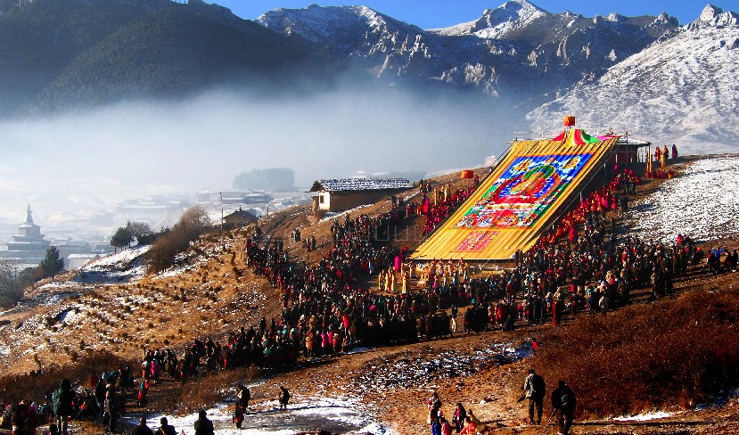 其中有1757年清代乾隆皇帝賜予該寺鑲滿金銀珠寶、書有漢滿蒙藏四種文字的盔甲,國家特級文物、純金汗書寫而成的藏文《大藏經(jīng)》中的整套《甘珠爾》佛經(jīng),由十六羅漢和四大天王等組成的整套二十四幅的緙絲唐卡“唐繡”,這些文物都展示出明清兩代中央政府和西藏地方之間的親密關(guān)系。其中二十四幅要展示三周,形成了該寺一年一度規(guī)模盛大的“甘丹繡唐節(jié)”。