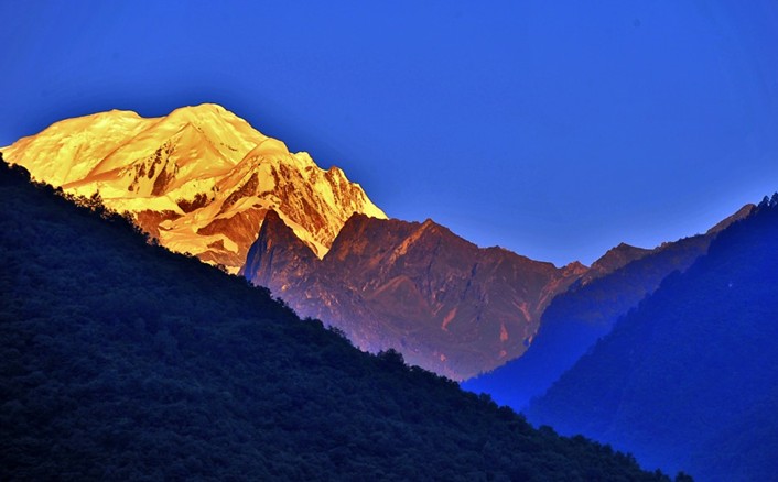 貢嘎山(Minya Konka)位于四川省康定以南,是大雪山的主峰。周?chē)泻0?,000公尺以上的山峰45座,主峰更聳立于群峰之巔,海拔7,556公尺。高出其東側(cè)大渡河6,000公尺,被喻為「蜀山之王」。主峰由花崗閃長(zhǎng)巖組成,受海洋季風(fēng)影響,雪線海拔4,600~4,700公尺,冰川發(fā)育規(guī)模較大。東坡最大的海螺溝冰川長(zhǎng)14.2公里,末端下達(dá)2,850公尺,已落入森林帶內(nèi),在長(zhǎng)期冰川作用下,山峰發(fā)育為錐狀大角峰,周?chē)@以60°~70°的峭壁,攀登困難。1932年,美國(guó)探險(xiǎn)隊(duì)攀登成功。中國(guó)大陸登山隊(duì)于1957年6月到達(dá)峰頂。
