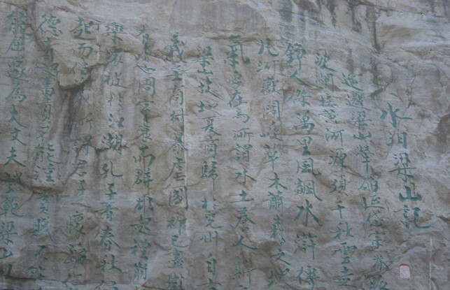 《水泊梁山記》是著名書畫大師范曾2002年專為水泊梁山風(fēng)景區(qū)撰寫。先生懷著對英雄故里的一腔深情,慷慨揮毫、步其先人范仲淹《岳陽樓記》韻,全文368字,描述了水泊梁山河岳闊峻、草木蕭森的雄奇景象?!端戳荷接洝反笮湍ρ率蹋ǜ?米、長14米,距地面10余米,單字最大55厘米見方,最小字30厘米見方,通篇368字占地近100平方米,氣勢恢弘、蔚為大觀,形成了南有《岳陽樓記》、北有《水泊梁山記》的文化格局。為旅游勝地水泊梁山再添景觀,現(xiàn)為水泊梁山風(fēng)景區(qū)的主要景點(diǎn)之一。與梁山粗獷豪放的山體及周圍環(huán)境交融,深化了景區(qū)的水滸文化內(nèi)涵,成為進(jìn)入梁山風(fēng)景區(qū)山寨景區(qū)的標(biāo)志性景觀,其所在廣場,亦成為在梁山舉行的與水滸、旅游有關(guān)的大型集會的場所之一。