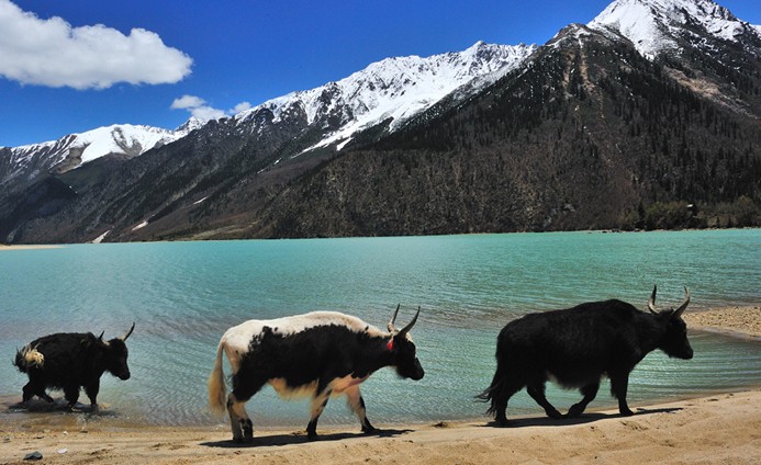 然烏湖北面有著名的拉古冰川,冰川延伸到湖邊。每當(dāng)冰雪融化時(shí),雪水便注入湖中,使然烏湖經(jīng)常保有豐富的水源。然烏湖邊是綠草茵茵的草場(chǎng)和綠油油的莊稼;湖邊山腰上則是莽莽的森林,再往上是五顏六色的杜鵑花和灌木叢林帶;山頂則是終年不化、重疊起伏的雪山。