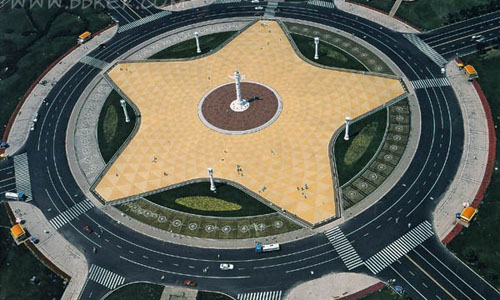 從廣場中央大道中心點往北500米是會展中心;往南是百年城雕廣場,500米外是藍色的大海。中央大道紅磚鋪地,兩側(cè)綠草如茵,每隔20米設一個航標燈造型的石柱燈,象征著中國正面向大海,走向世界。