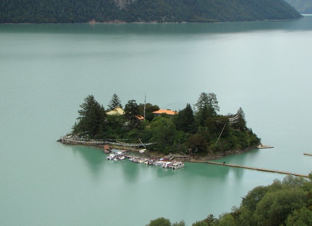 小島上有唐代的建筑“錯宗工巴寺”,是西藏有名的紅教寧瑪派寺廟,建于唐代末年,距今已有1500多年的歷史了。錯宗寺為土木結(jié)構(gòu),上下兩層,殿內(nèi)主供蓮花生、千手觀音和金童玉女。寺南有一株桃和松的連理樹,春天時,桃花與青松相映,煞是好看。