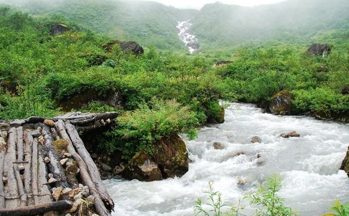 朵尼拉繪聲繪色的述說(shuō),使我們這些外來(lái)人深切地感到,墨脫是個(gè)神秘的地方,難怪在這里有著許多可供信徒朝拜的圣地,其中著名的就有仰桑河、布達(dá)切波雪峰和宮堆頗章。清澈味甜的仰桑河。